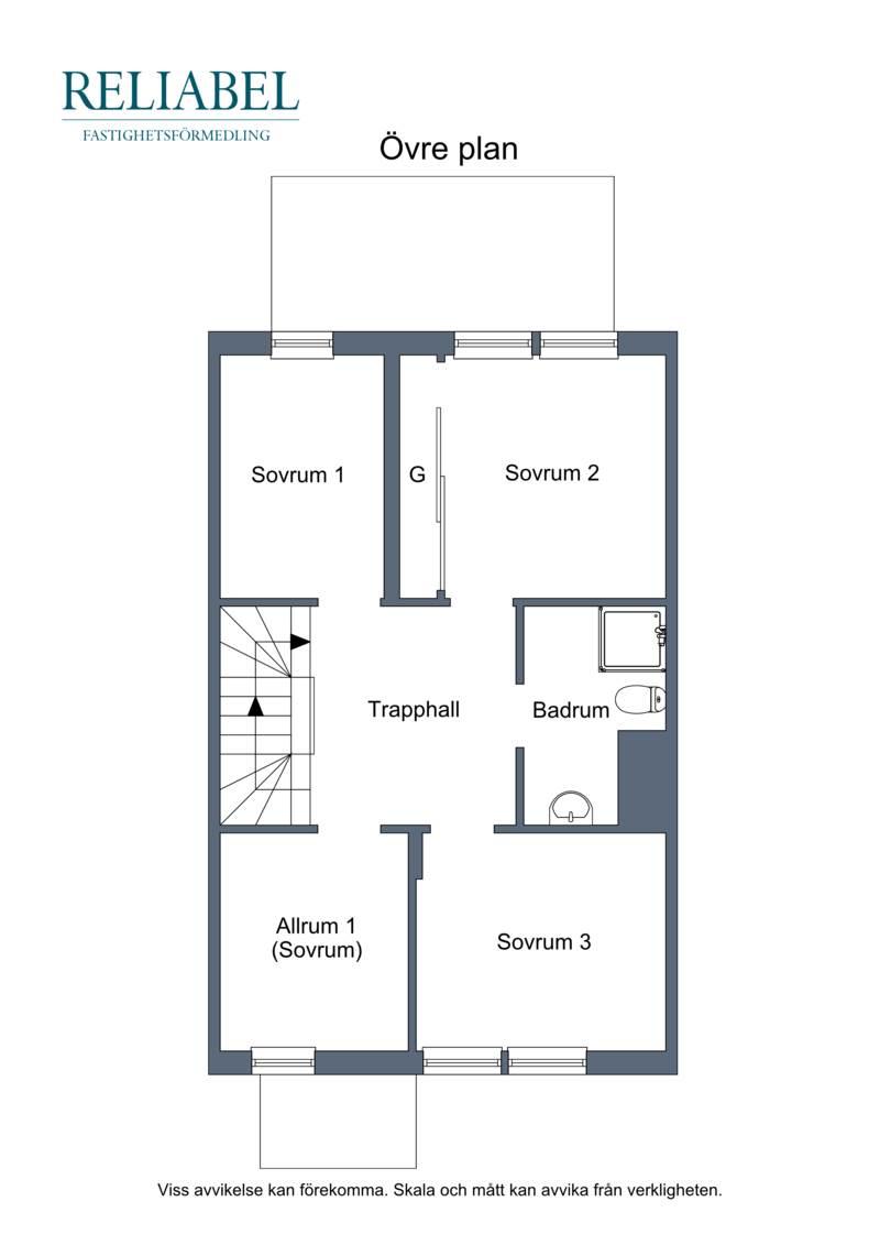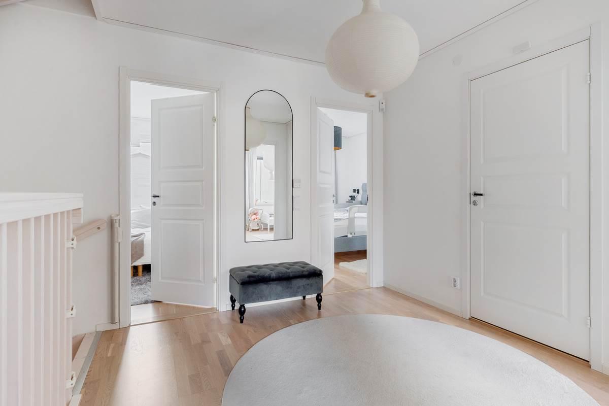 På övre plan återfinns fyra sovrum i varierande storlek, vilket gör detta plan idealiskt för den större familjen eller för dig som önskar flera barnrum, gästrum eller hemmakontor. Här finns även ett stilrent badrum samt en praktisk trapphall.