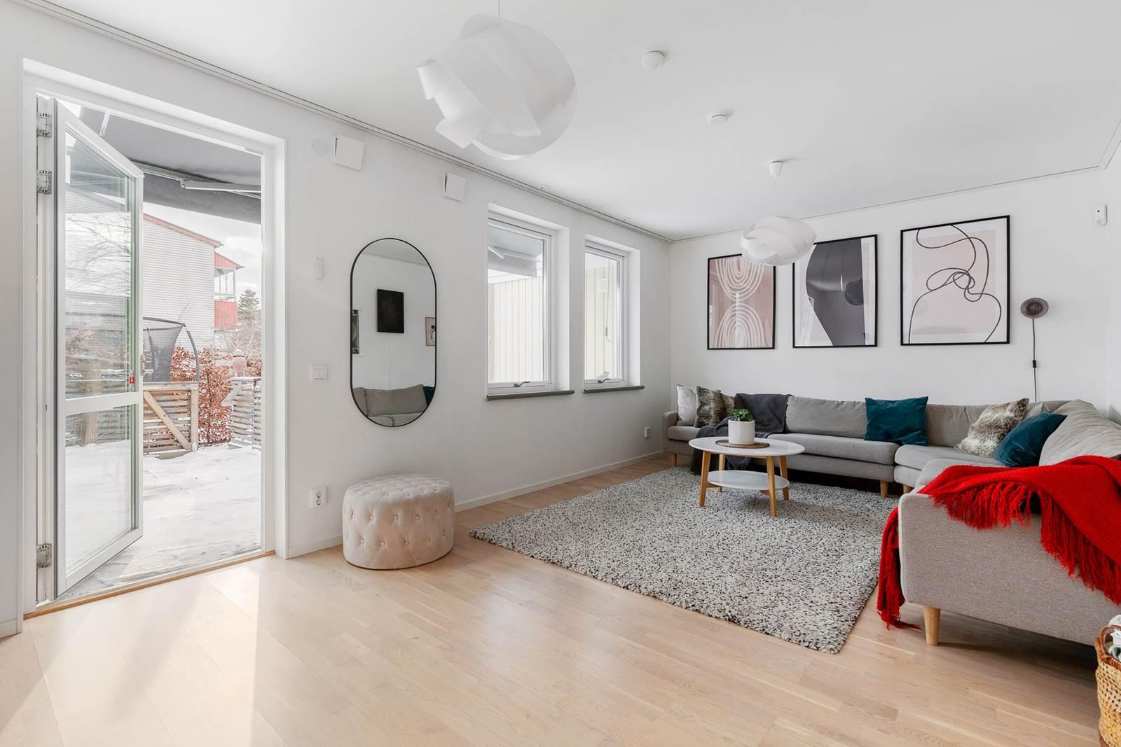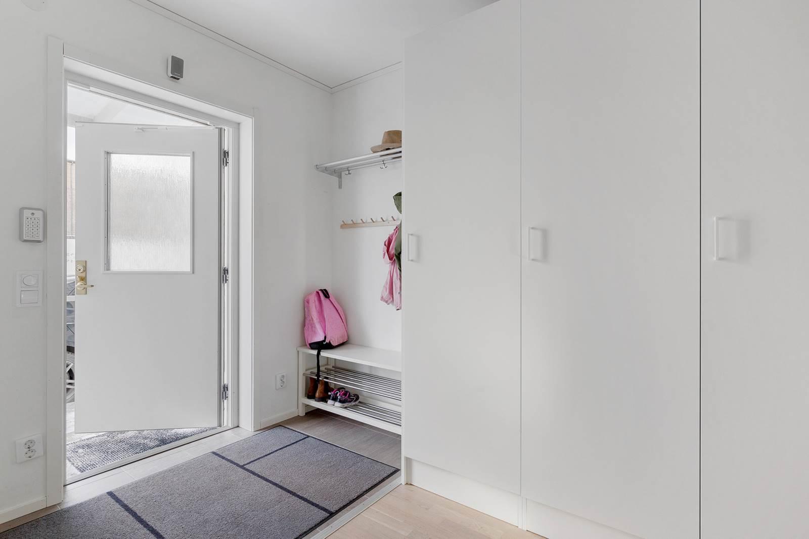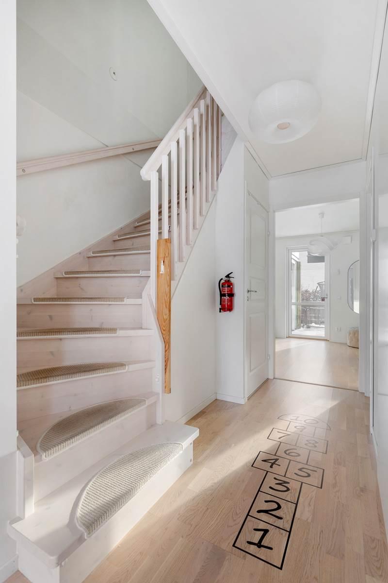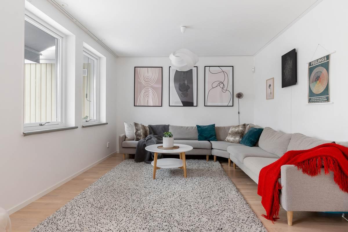 På entréplanet möts du av en välkomnande hall med goda förvaringsmöjligheter. Här finns ett modernt kök med bra arbetsytor och stilrena materialval samt plats för matbord. Vidare finns ett helkaklat badrum med tvättmaskin och torktumlare. Det rymliga vardagsrummet erbjuder gott om plats för både soffgrupp och matplats och har ett fint ljusinsläpp. Härifrån nås bostadens altan och trädgård, perfekt för sommarens grillkvällar och umgänge.