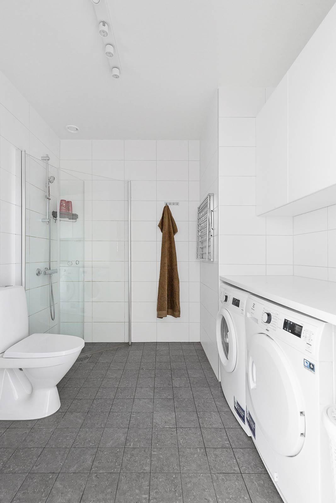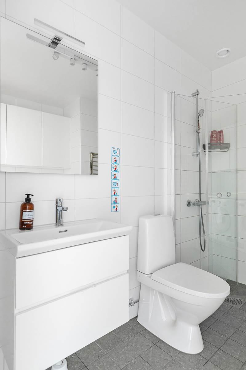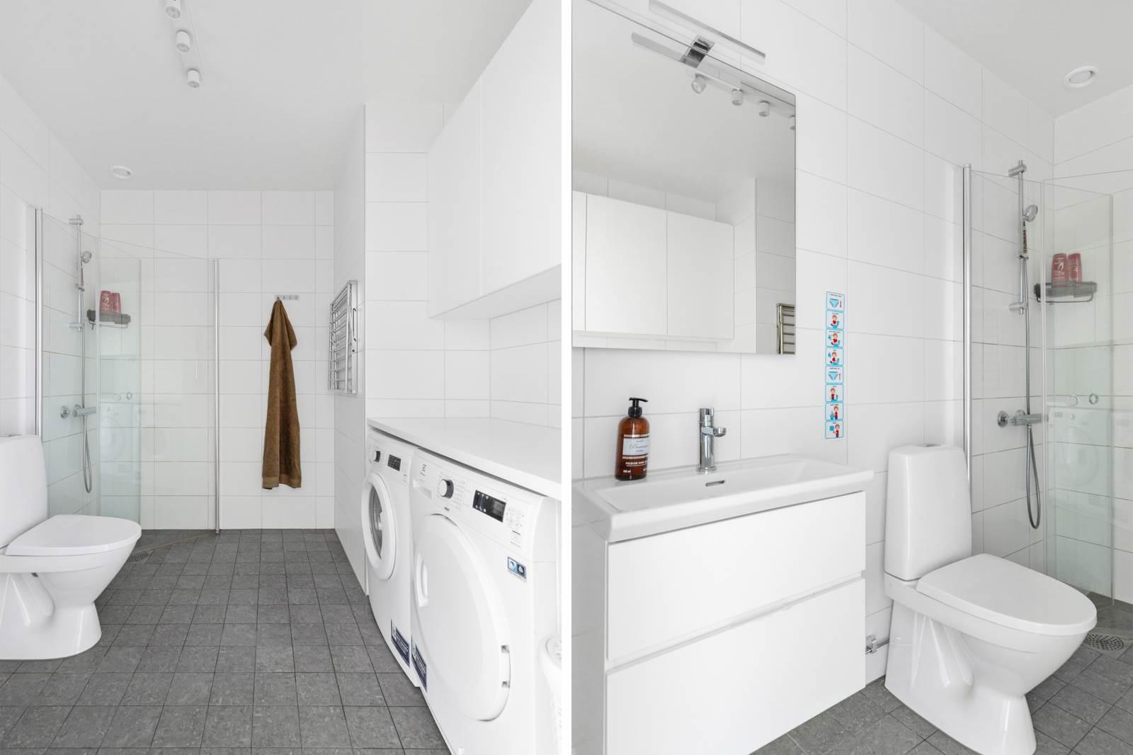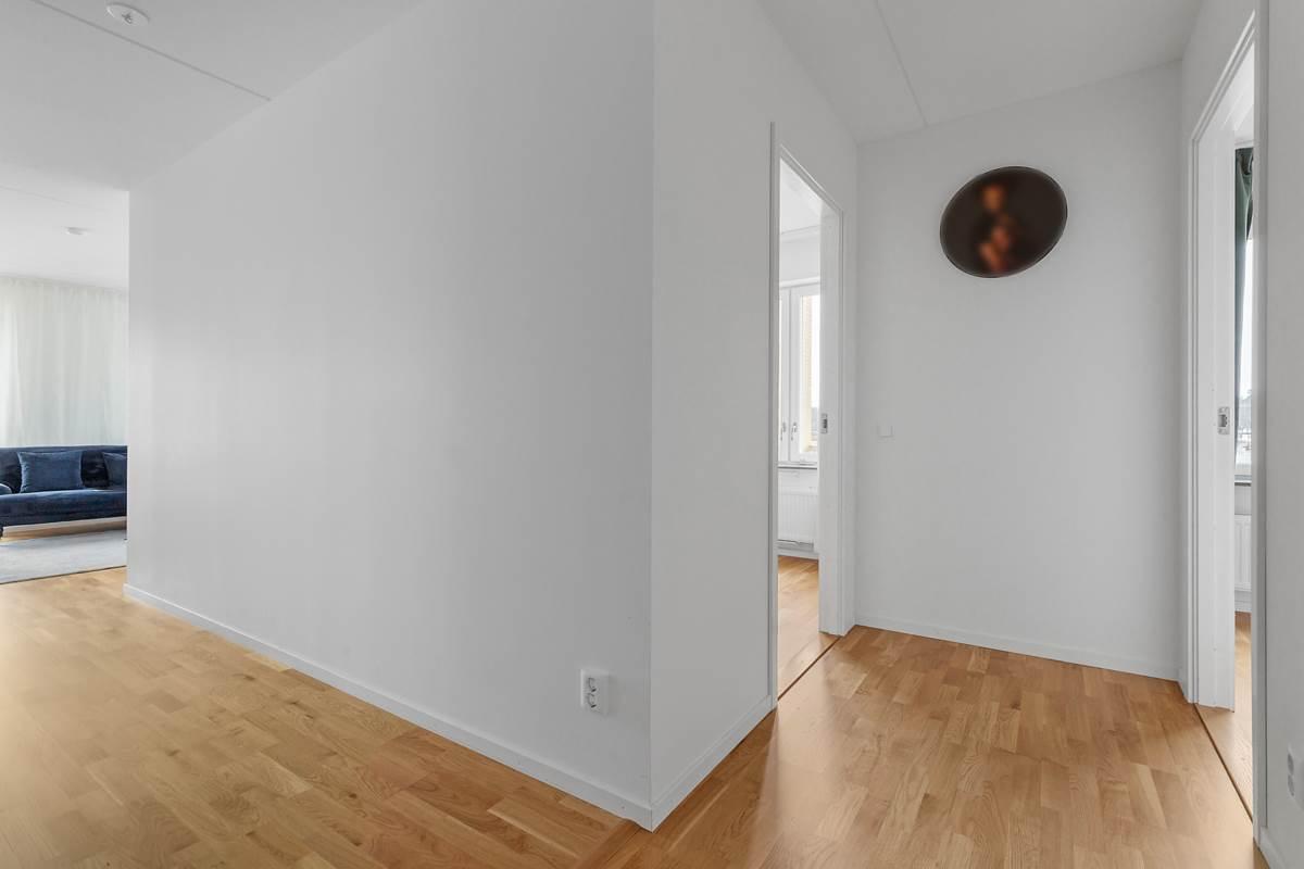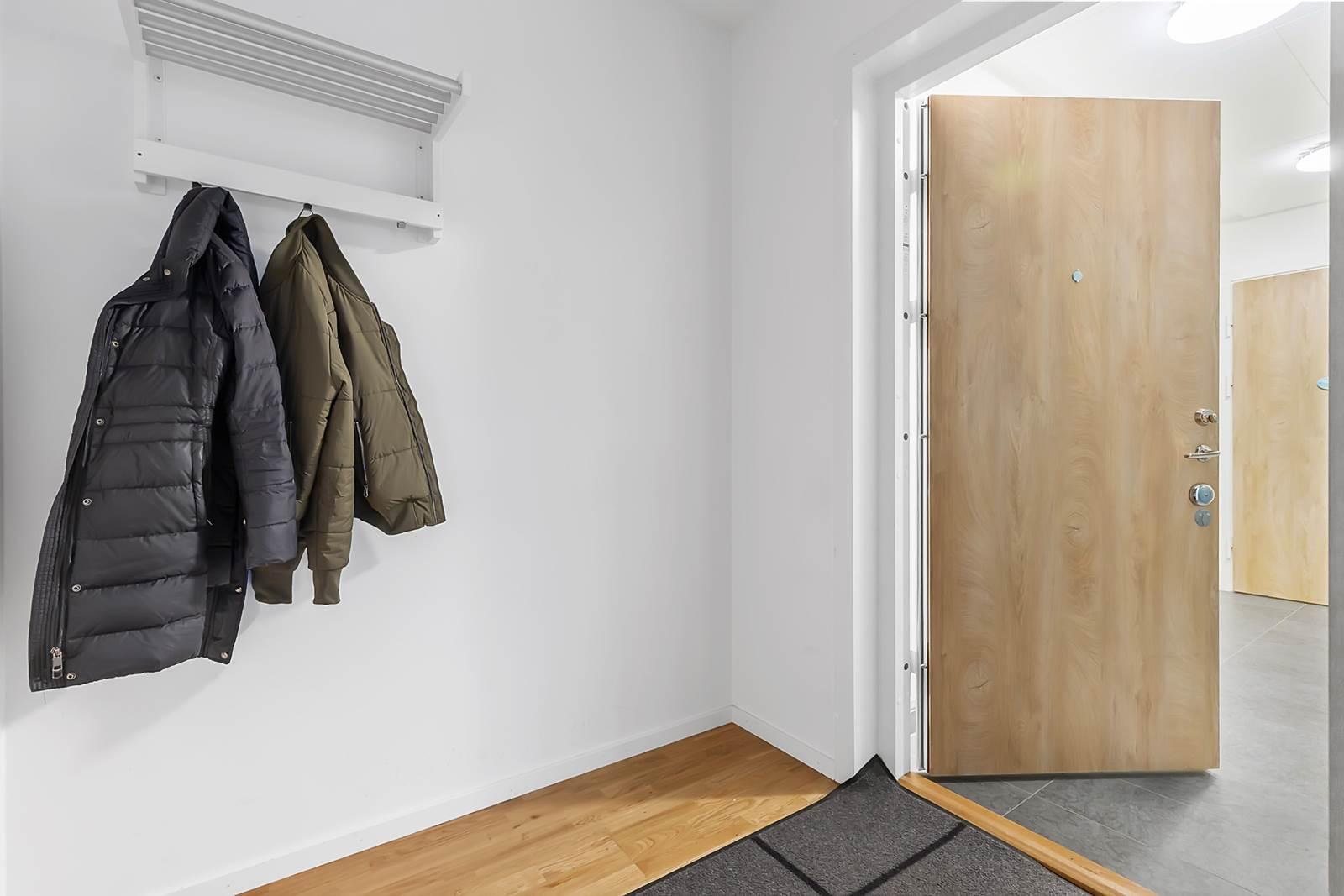 När du kliver in i lägenheten välkomnas du av en rymlig hall med gott om förvaringsutrymme för att organisera dina ytterkläder och skor. Precis intill hallen hittar du det stora och välutrustade badrummet.