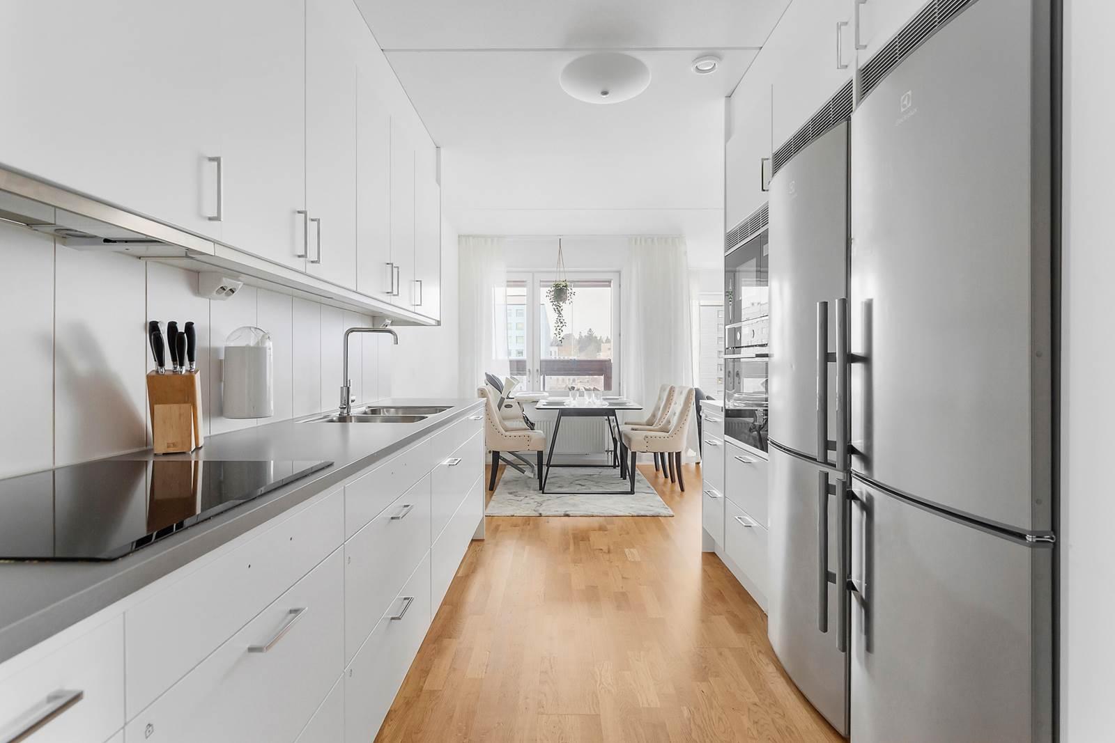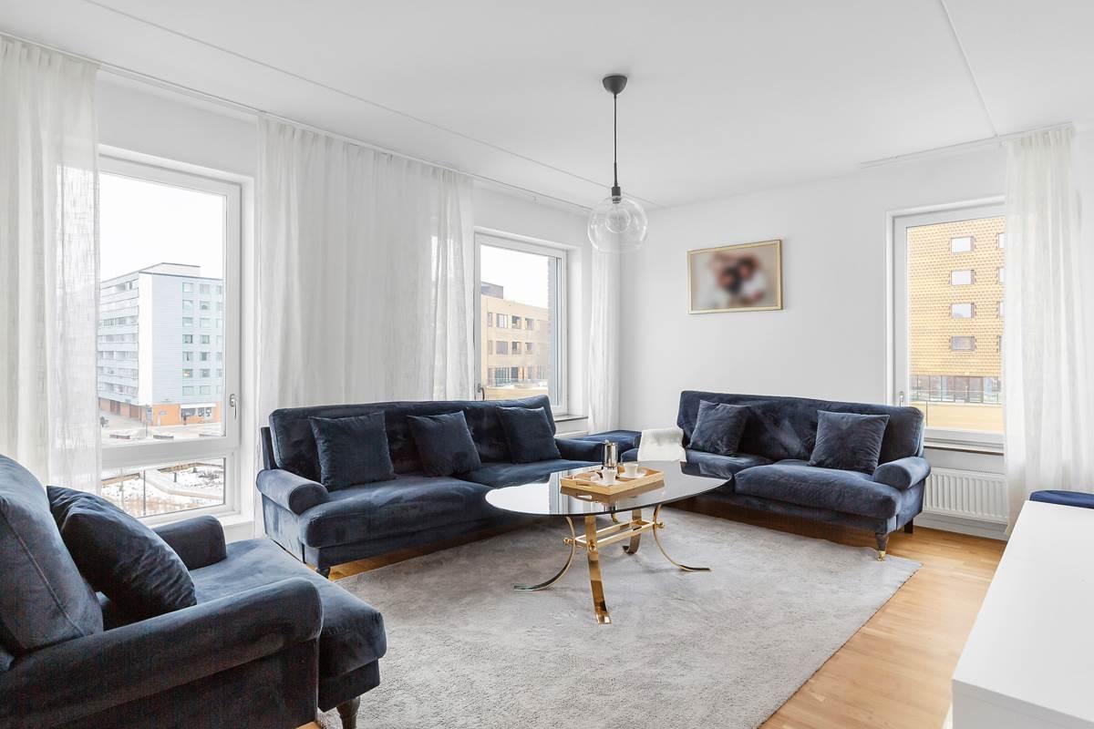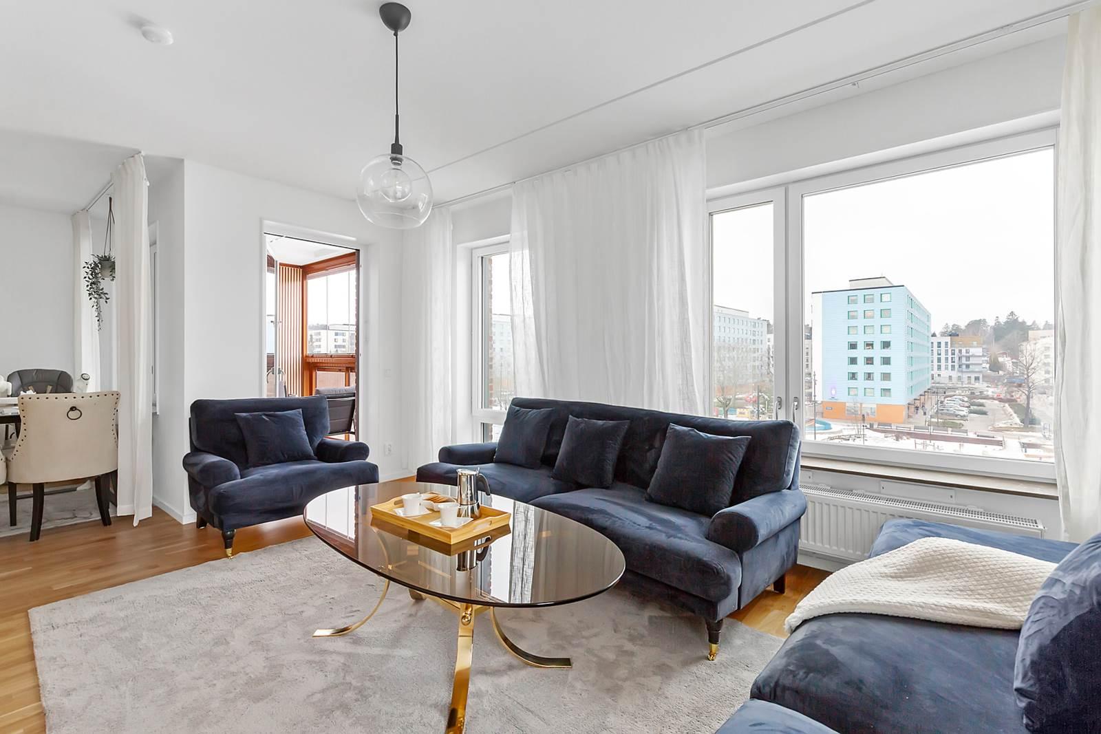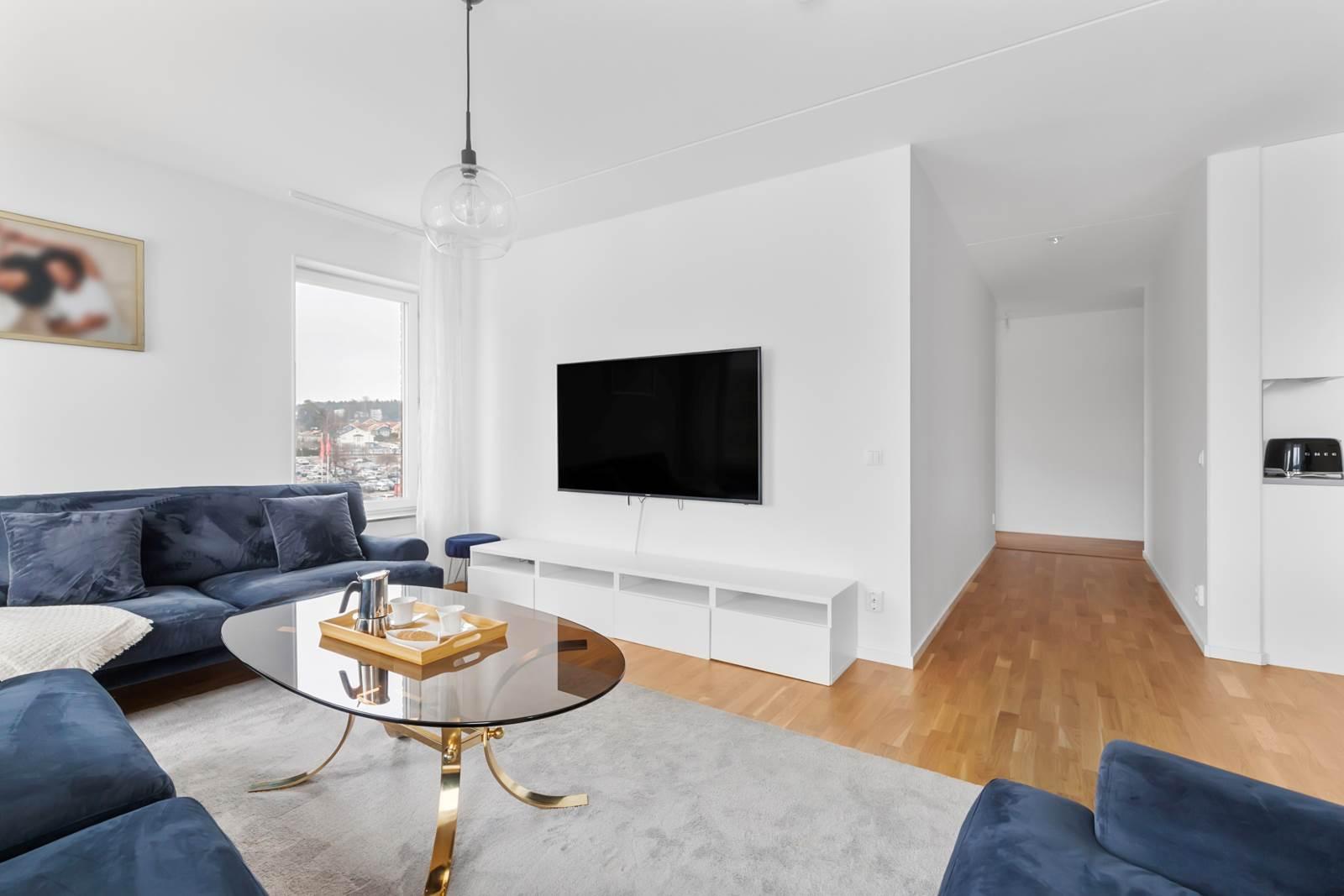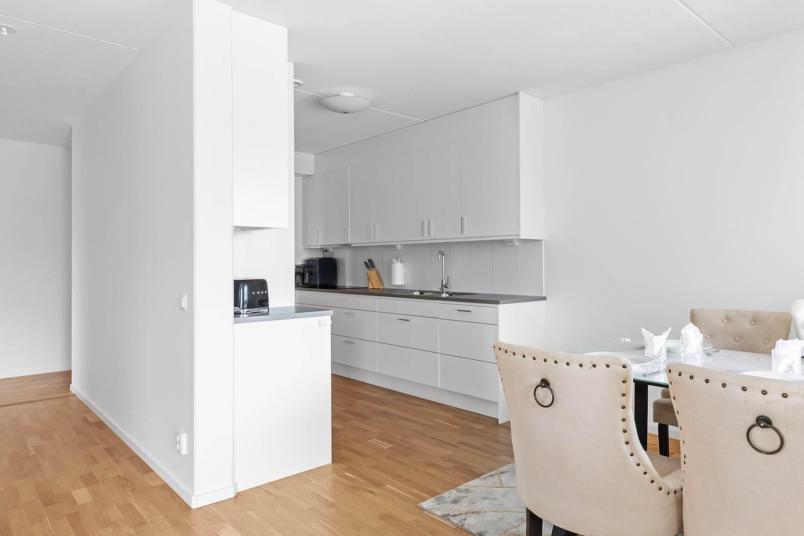 Vidare in i lägenheten finner du den öppna planlösningen mellan kök och vardagsrum som skapar en mysig och inbjudande atmosfär. Tack vare bostadens gavelläge får du fantastiskt ljusinflöde som fyller rummet med naturligt ljus och ger en ljus och luftig känsla. Här finns gott om plats för stora soffgrupper, perfekt för avkoppling och umgänge med familj och vänner. Köket är modernt utformat med stilfulla ytor och högkvalitativ utrustning som gör matlagningen till en fröjd. Den generösa ytan ger gott om utrymme att röra sig fritt och njuta av måltider med nära och kära. Från vardagsrummet har du tillgång till en härlig balkong i västerläge där du kan njuta av solen under större delen av dagen.