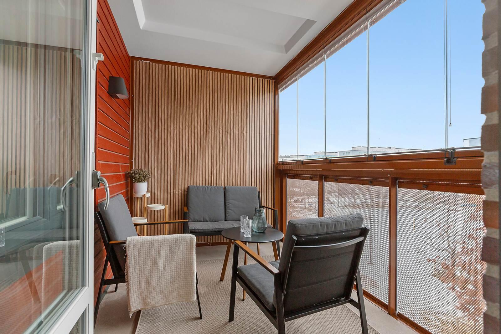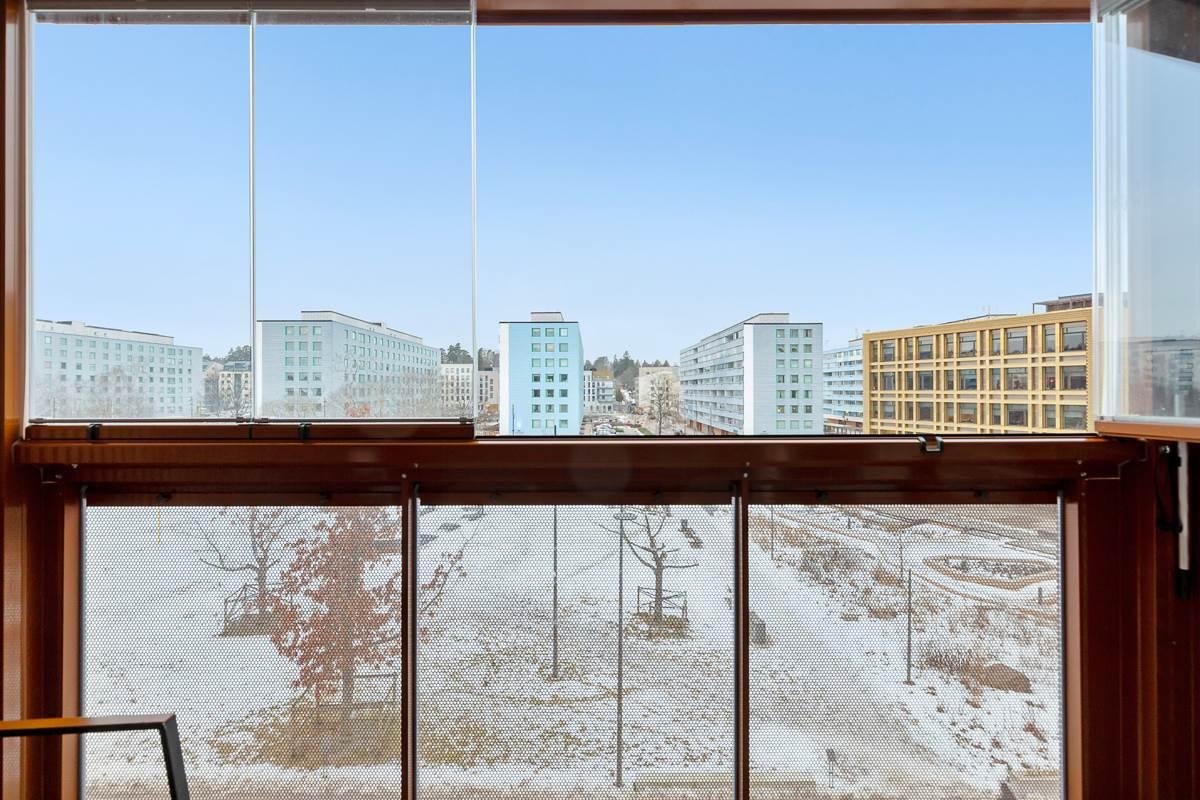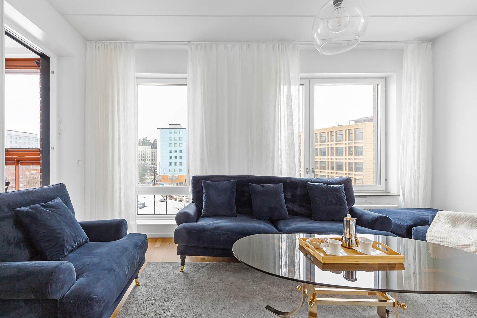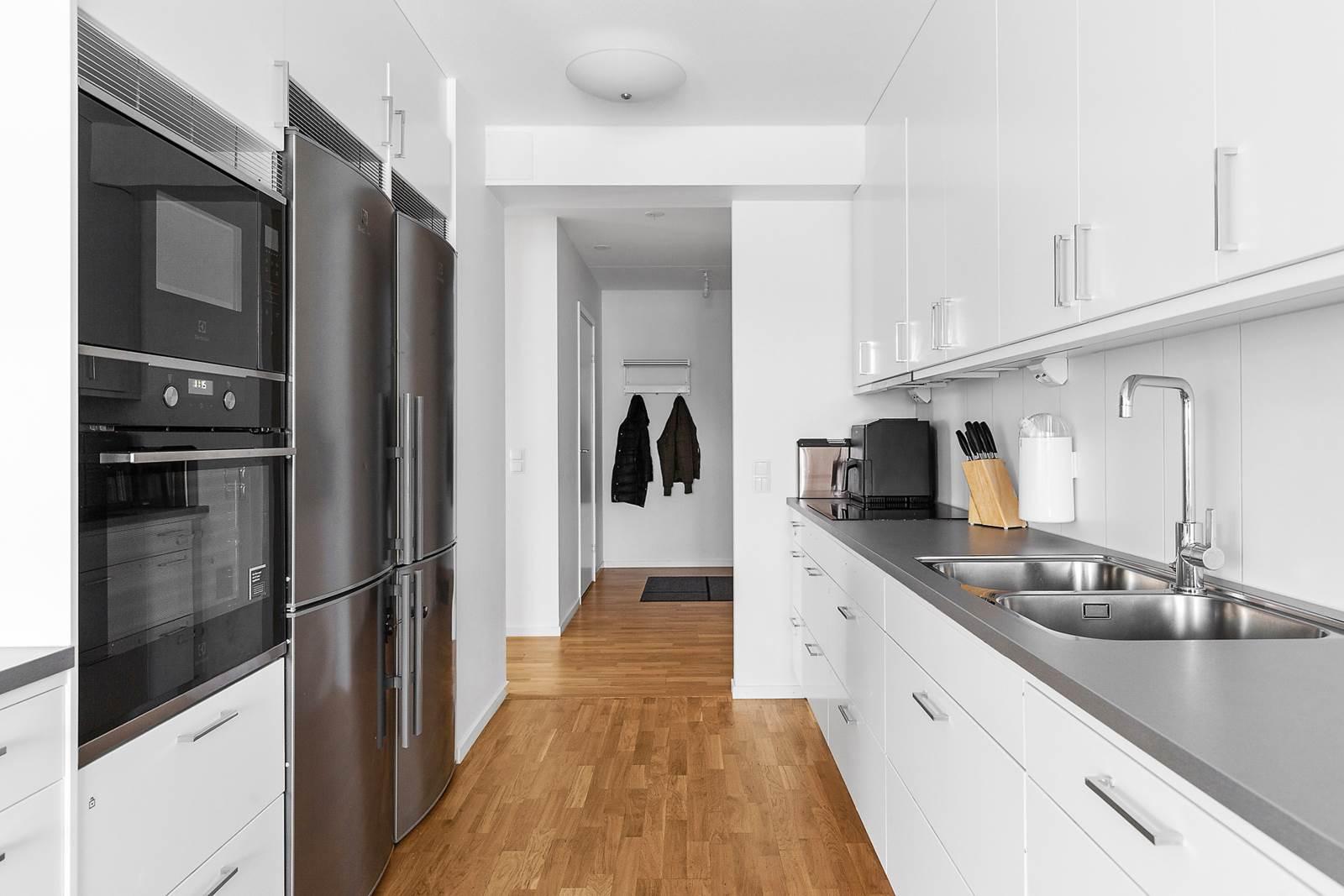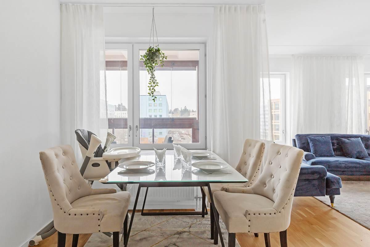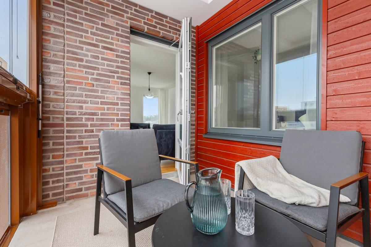 Vidare in i lägenheten finner du den öppna planlösningen mellan kök och vardagsrum som skapar en mysig och inbjudande atmosfär. Tack vare bostadens gavelläge får du fantastiskt ljusinflöde som fyller rummet med naturligt ljus och ger en ljus och luftig känsla. Här finns gott om plats för stora soffgrupper, perfekt för avkoppling och umgänge med familj och vänner. Köket är modernt utformat med stilfulla ytor och högkvalitativ utrustning som gör matlagningen till en fröjd. Den generösa ytan ger gott om utrymme att röra sig fritt och njuta av måltider med nära och kära. Från vardagsrummet har du tillgång till en härlig balkong i västerläge där du kan njuta av solen under större delen av dagen.