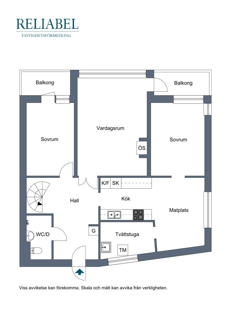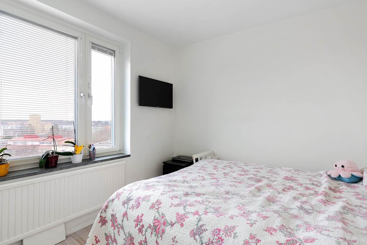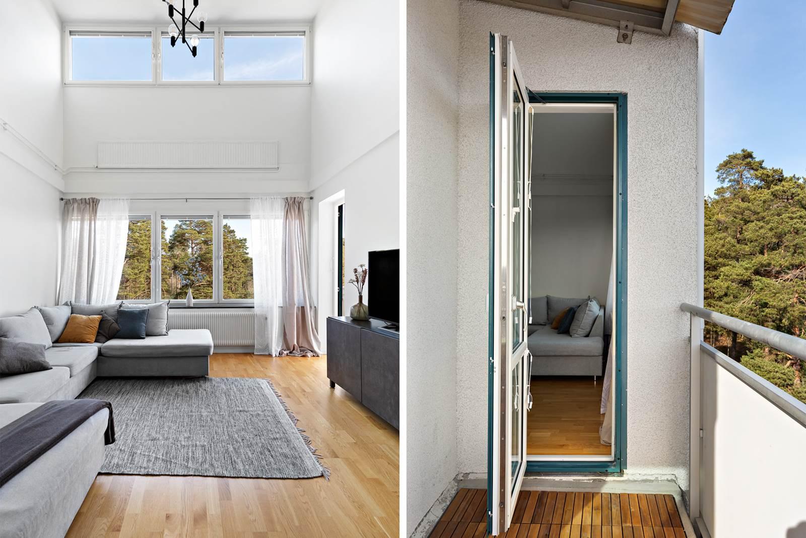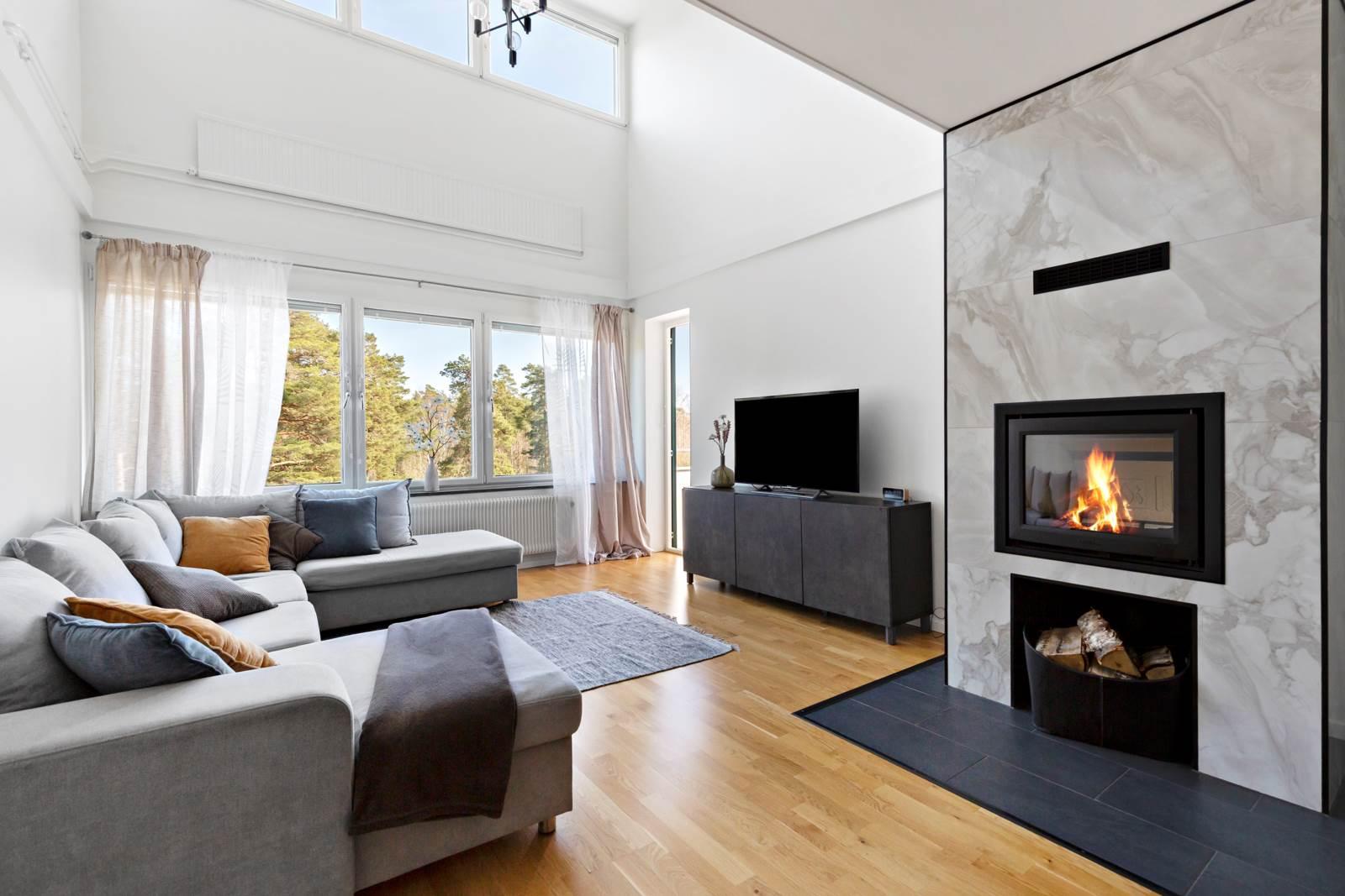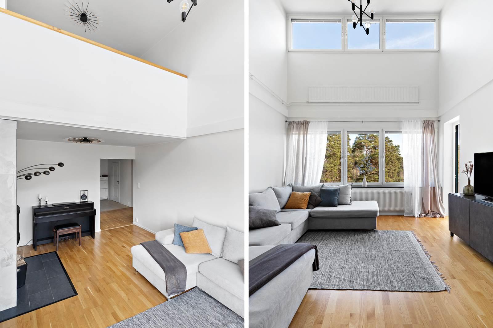 Det stora vardagsrummet är ljust och socialt med plats för både soffgrupp och matplats samt en fungerande öppen spis som skapar en trivsam atmosfär. Här erbjuds även generös takhöjd som förstärker känslan av rymd. Härifrån nås även bostadens andra balkong. Köket är renoverat med modern inredning och erbjuder gott om arbetsyta och förvaring. Intill köket finns ett separat rum som idag används som sovrum och nås direkt från köket. Från köket finns även tillgång till en praktisk tvättstuga.