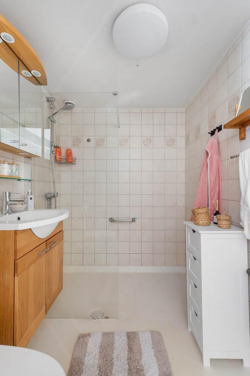 Sovrummet är lugnt beläget med plats för dubbelsäng och förvaring. Badrummet är praktiskt utformat och kompletteras av en separat tvättdel som förenklar vardagen. Hallen erbjuder goda förvaringsmöjligheter och binder samman bostadens ytor på ett naturligt sätt.