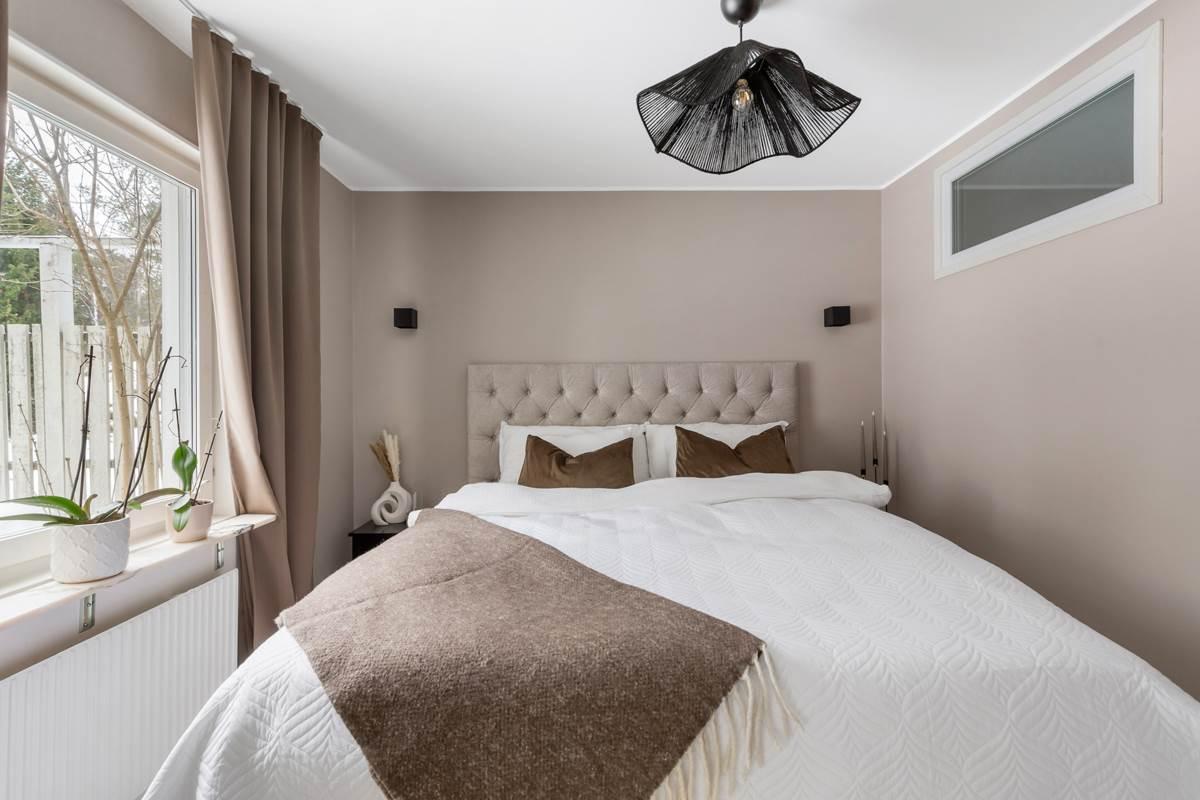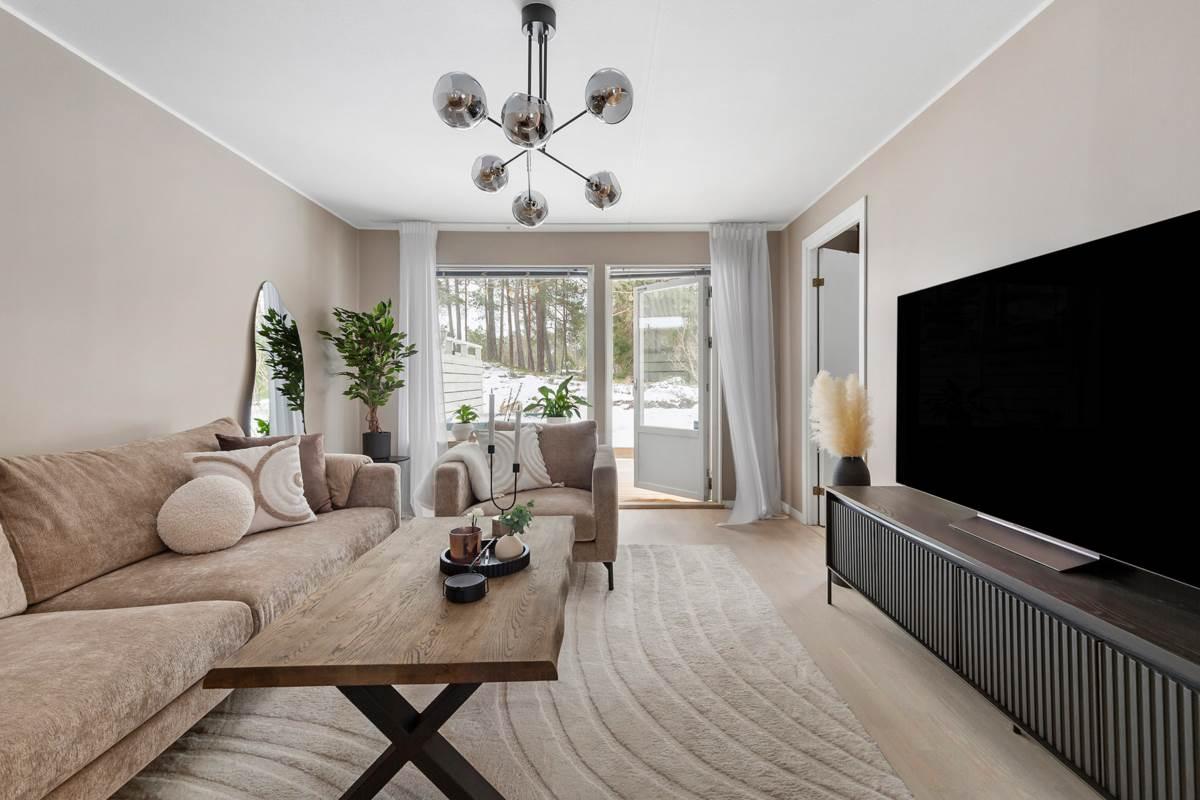 Bostaden har en genomtänkt planlösning med tydlig uppdelning mellan sociala ytor och privata rum. Vardagsrummet är generöst och lättmöblerat med plats för både soffgrupp och matbord, samt direkt utgång till uteplatsen på baksidan – perfekt för grillkvällar, avkoppling och umgänge under årets varmare månader.