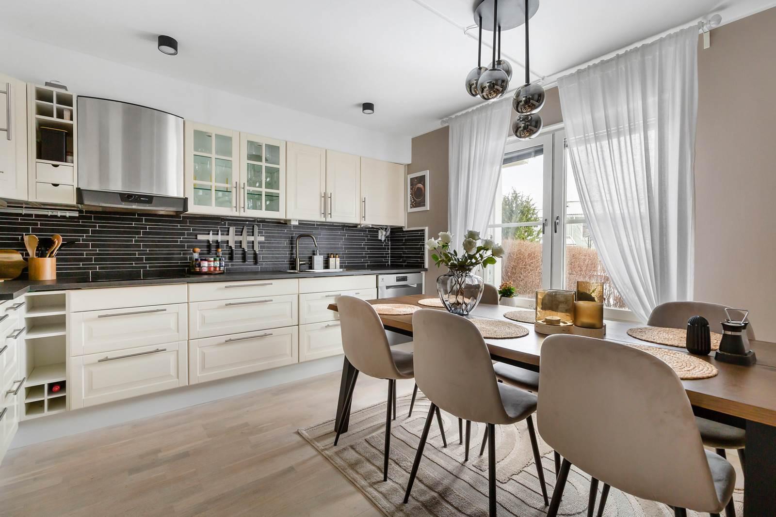 Köket är funktionellt utformat med goda arbetsytor, bra förvaring och plats för matbord. Härifrån nås även den andra uteplatsen på framsidan, vilket ger ett fint ljusinsläpp och extra flexibilitet i vardagen.
