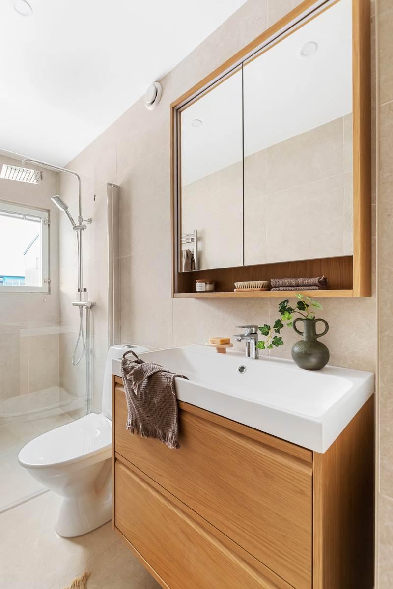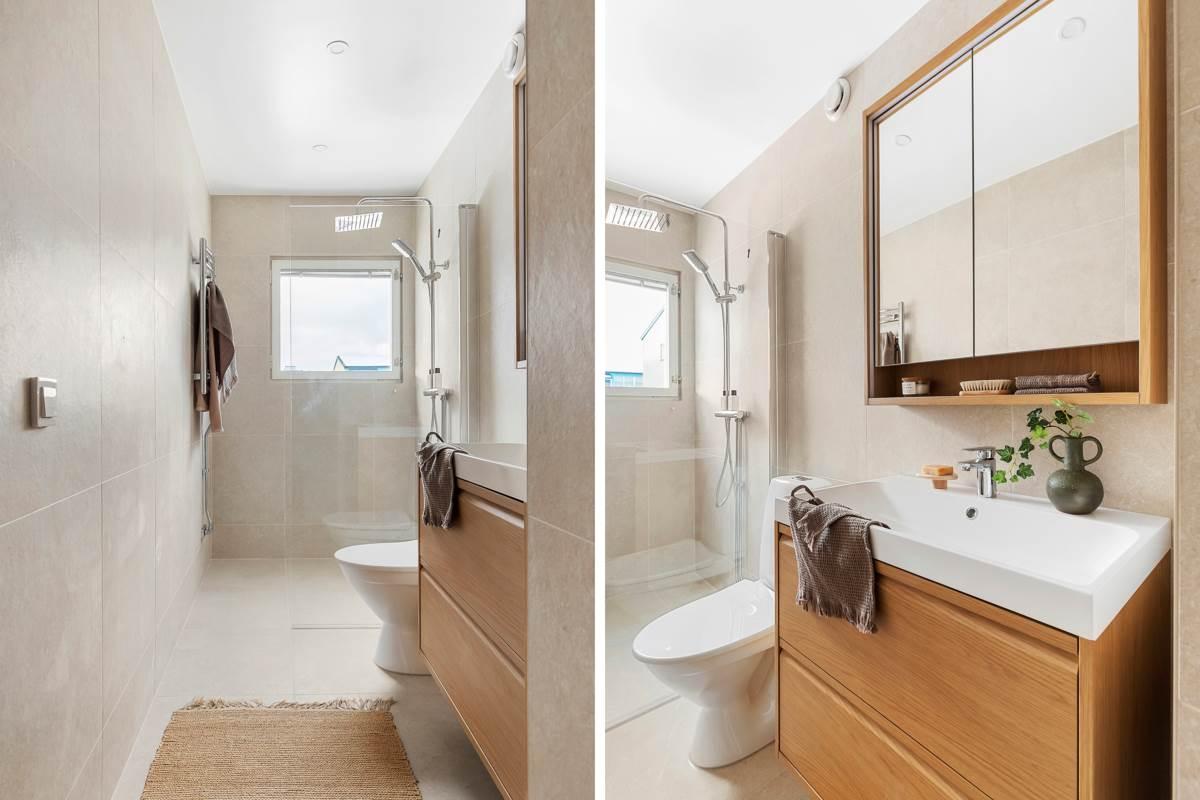 Redan i hallen möts du av goda förvaringsmöjligheter. Direkt till vänster ligger det stora, helkaklade badrummet, utrustat med tvättmaskin och torktumlare – ett stort plus för vardagskomforten.