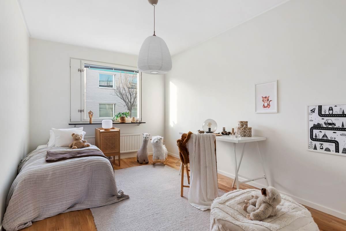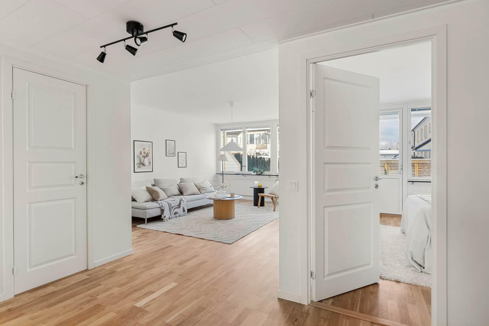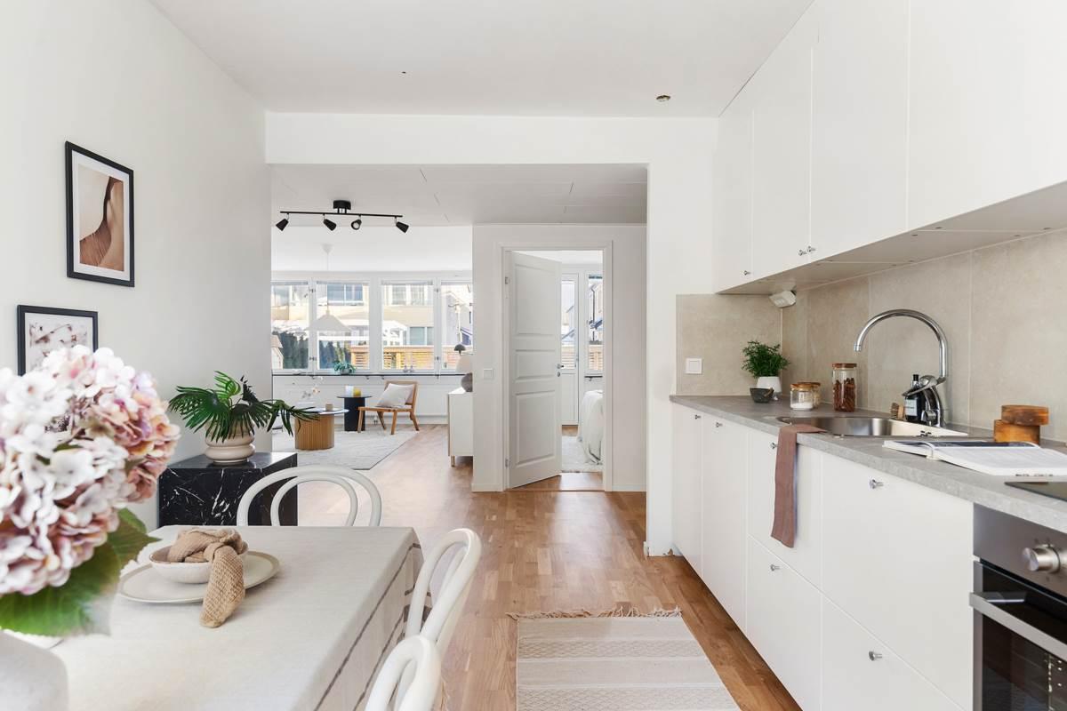 Lägenheten har genomgått en totalrenovering och präglas av genomgående parkettgolv som skapar en enhetlig och modern känsla i hela bostaden. Den välplanerade planlösningen erbjuder tre rum och kök med generösa ytor och fint ljusinsläpp.