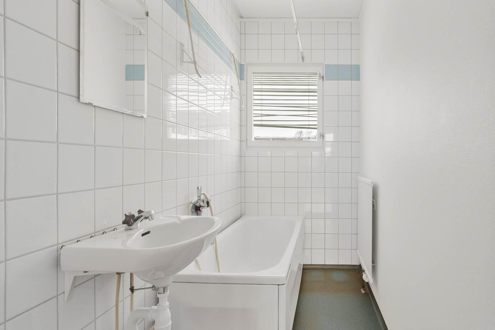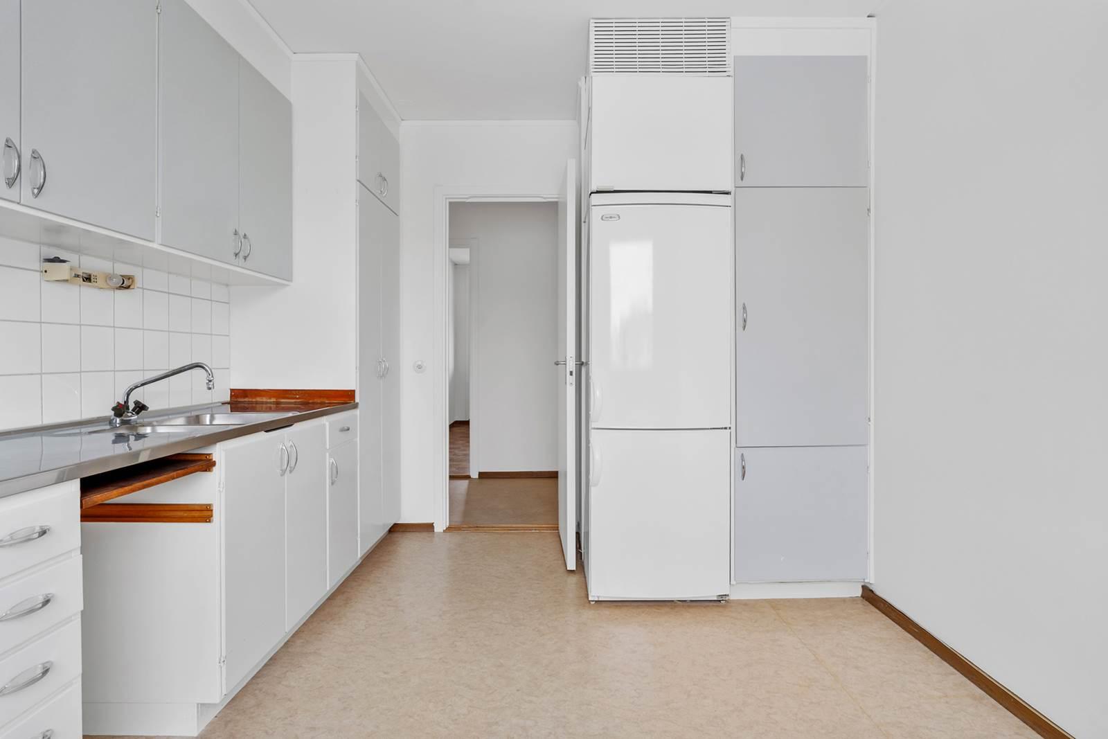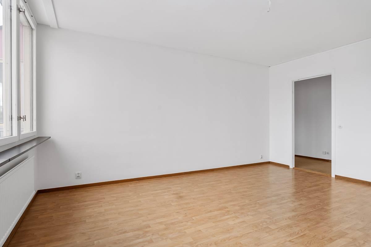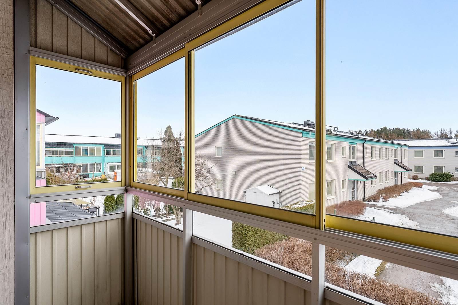 På höger sida finner du det stora badrummet. Köket är rymligt med gott om plats för matbordet och erbjuder bra förvaringslösningar och arbetsytor för matlagning. I vardagsrummet kan du njuta av fantastiskt ljusinsläpp från stora fönster. Dessutom finns generösa ytor för social samvaro med familj och vänner. Från sovrummet har du utgång till en inglasad balkong.