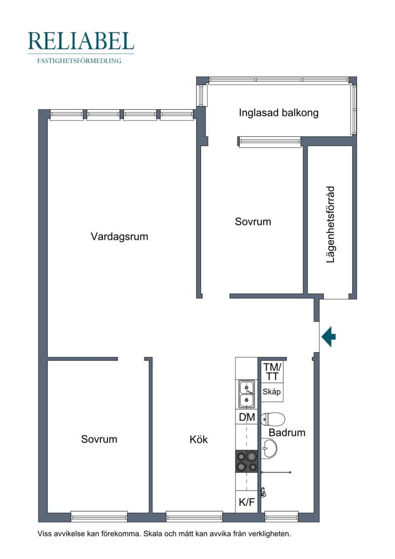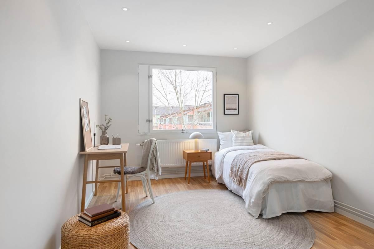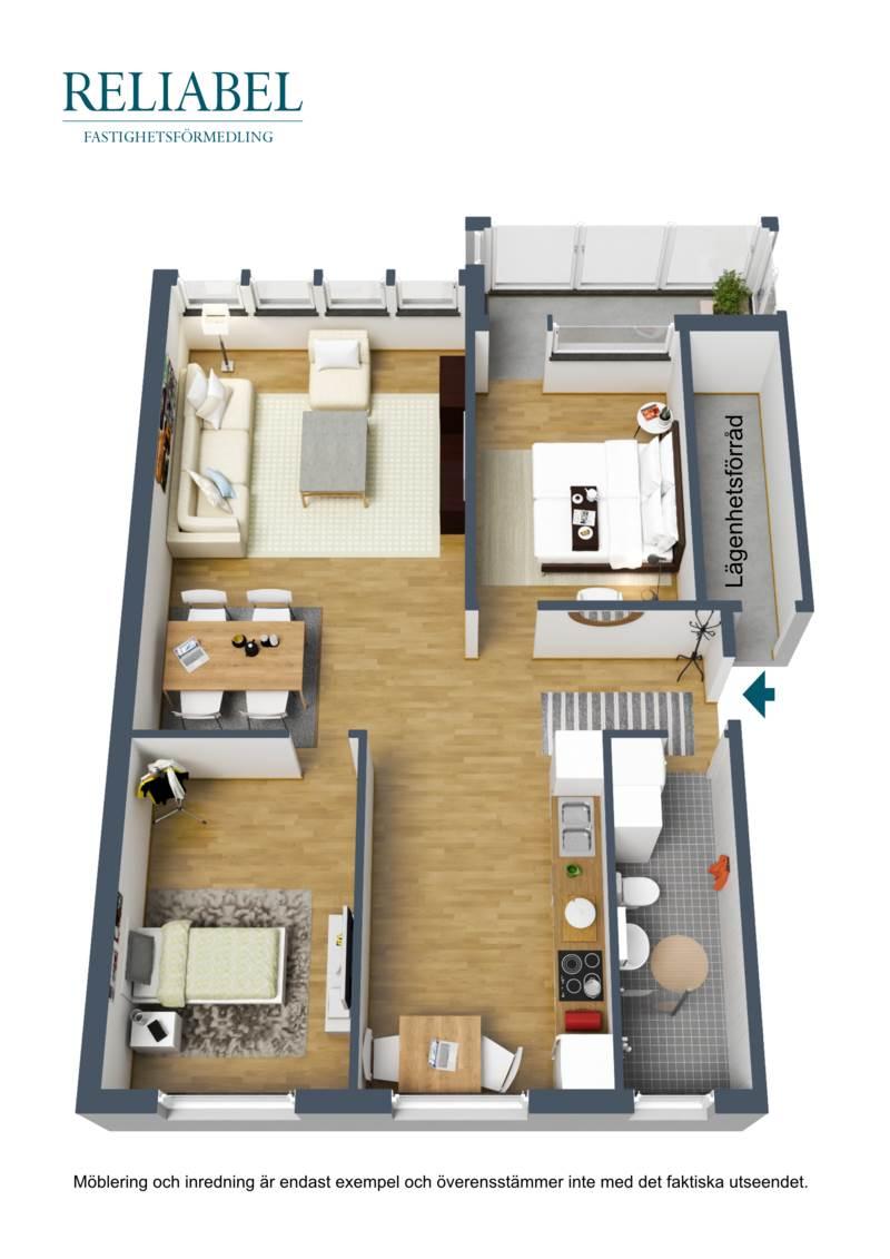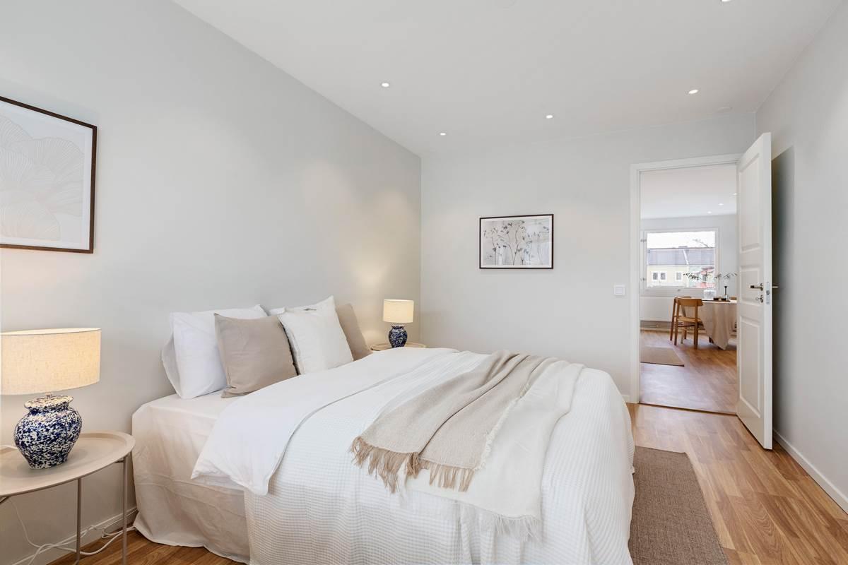 Lägenheten har två rymliga sovrum, varav ett har tillgång till en inglasad balkong. De två större sovrummen erbjuder gott om plats för dubbelsängar och har generösa förvaringsmöjligheter med garderober. Utöver detta finns ett stort förråd precis vid entrédörren som erbjuder extra förvaring på ett smidigt sätt.