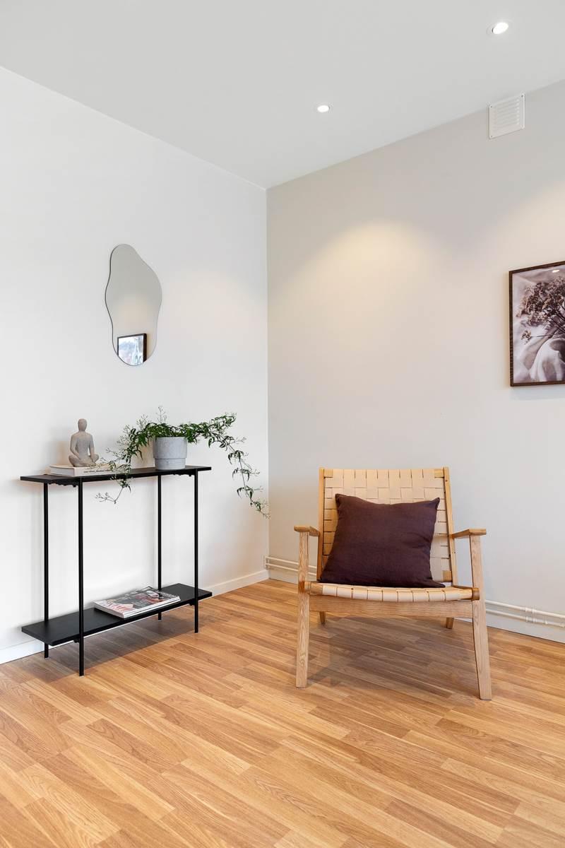 Lägenheten har en genomgående stilren interiör med ljusa ytskikt och väldisponerade kvadratmeter som maximerar både funktion och estetik. Ett fantastiskt ljusflöde förstärker den inbjudande känslan i alla rum. Vid entrén möts du av en rymlig hall med gott om förvaringsutrymme för att hålla ordning och skapa en praktisk vardag.