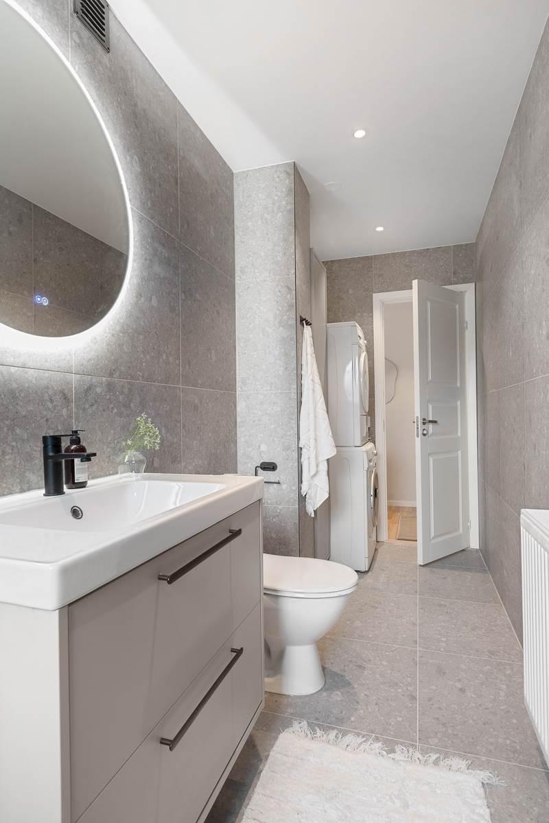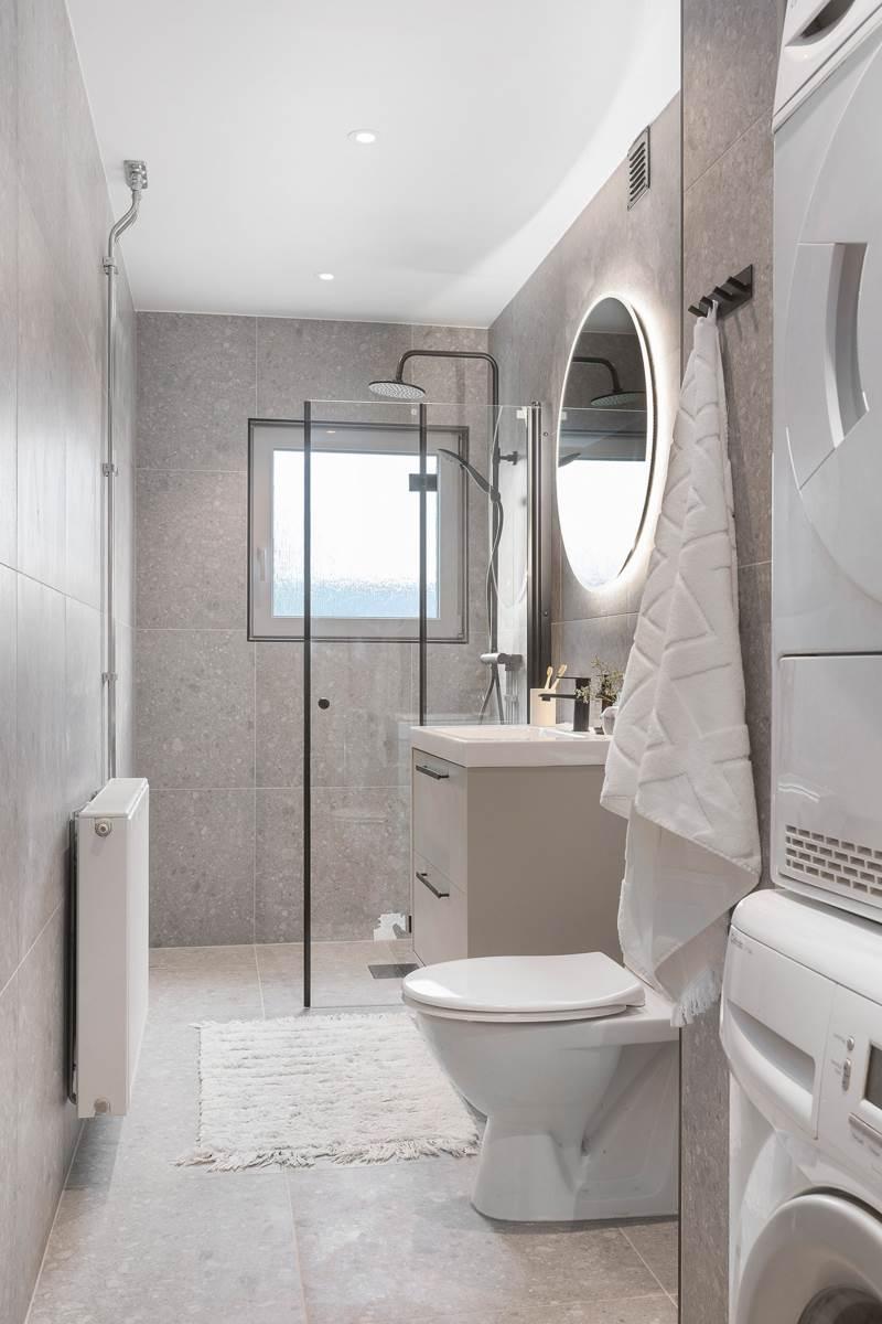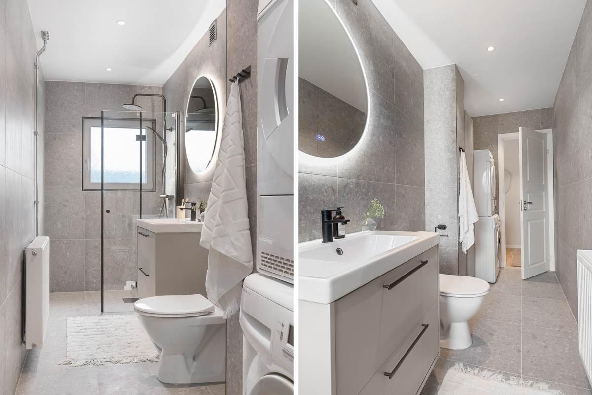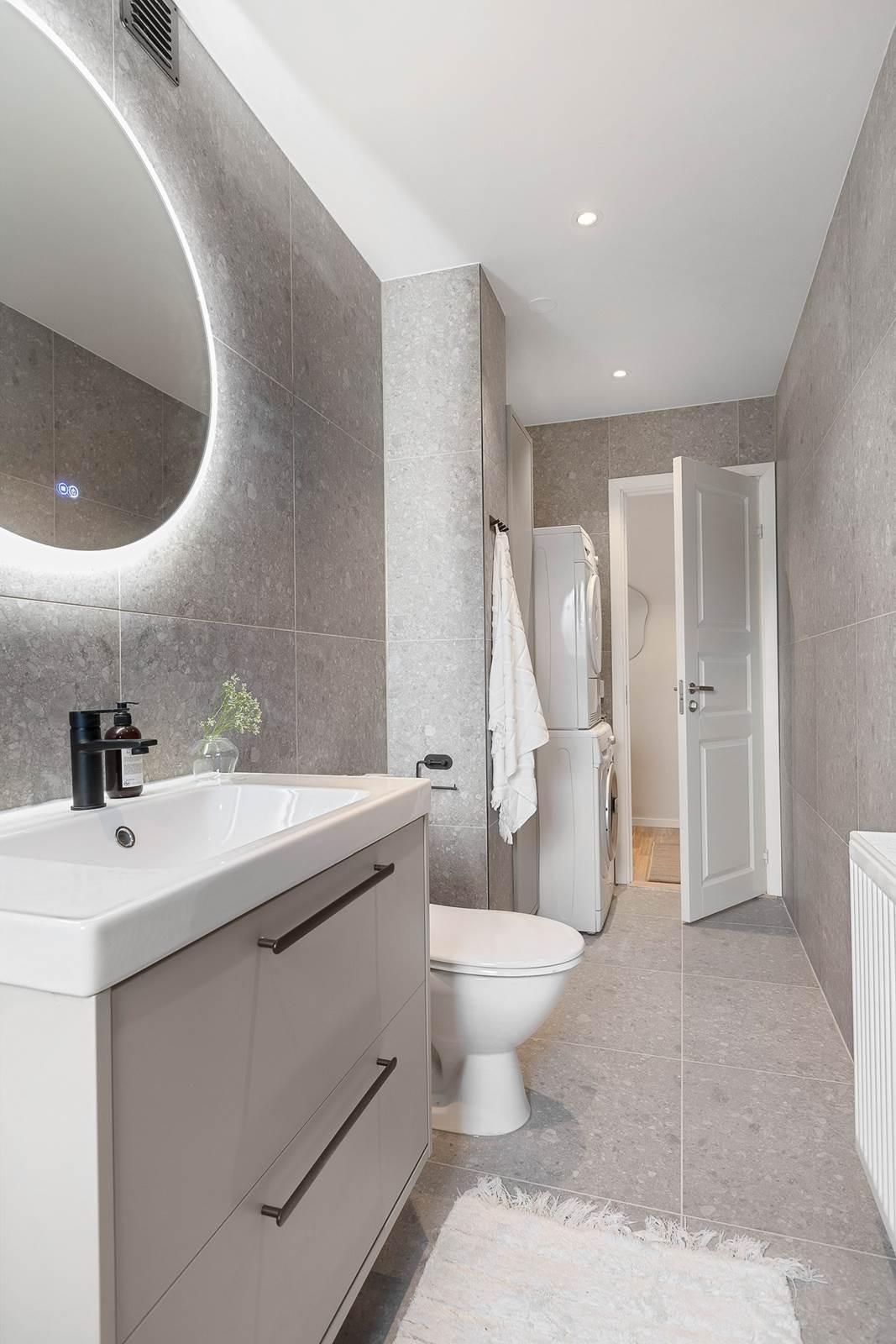 Badrummet är nyrenoverat och välutrustat med plats för både tvättmaskin och torktumlare.