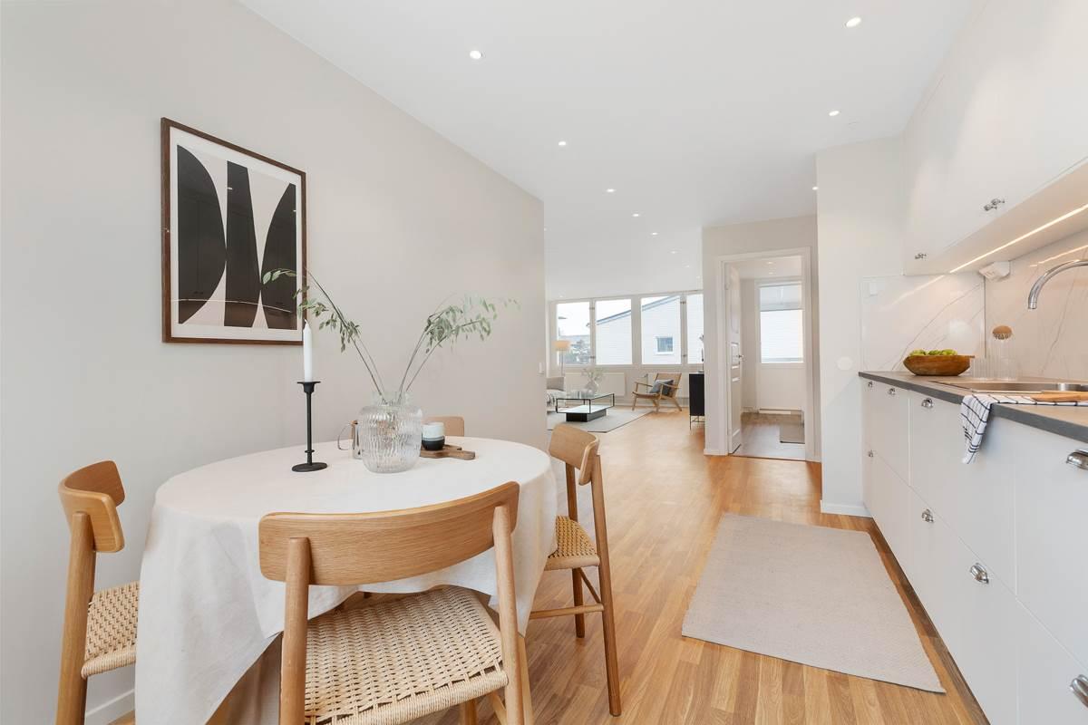 Det totalrenoverade köket är en dröm för den matlagningsintresserade med smarta förvaringslösningar och generösa arbetsytor som gör det enkelt att laga mat och umgås. Det rymliga vardagsrummet är en perfekt plats för avkoppling och sociala tillställningar, med gott om plats för både soffgrupper och matbord – en yta som bjuder in till umgänge och trivsel.