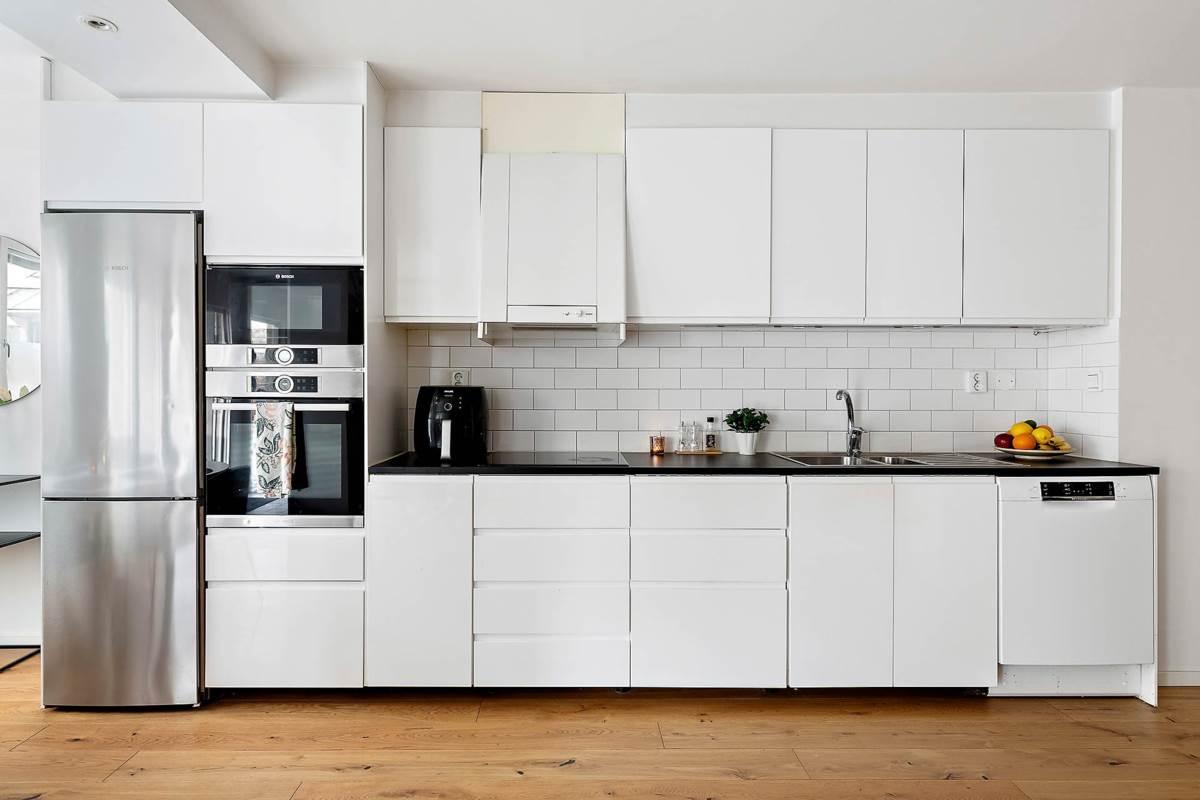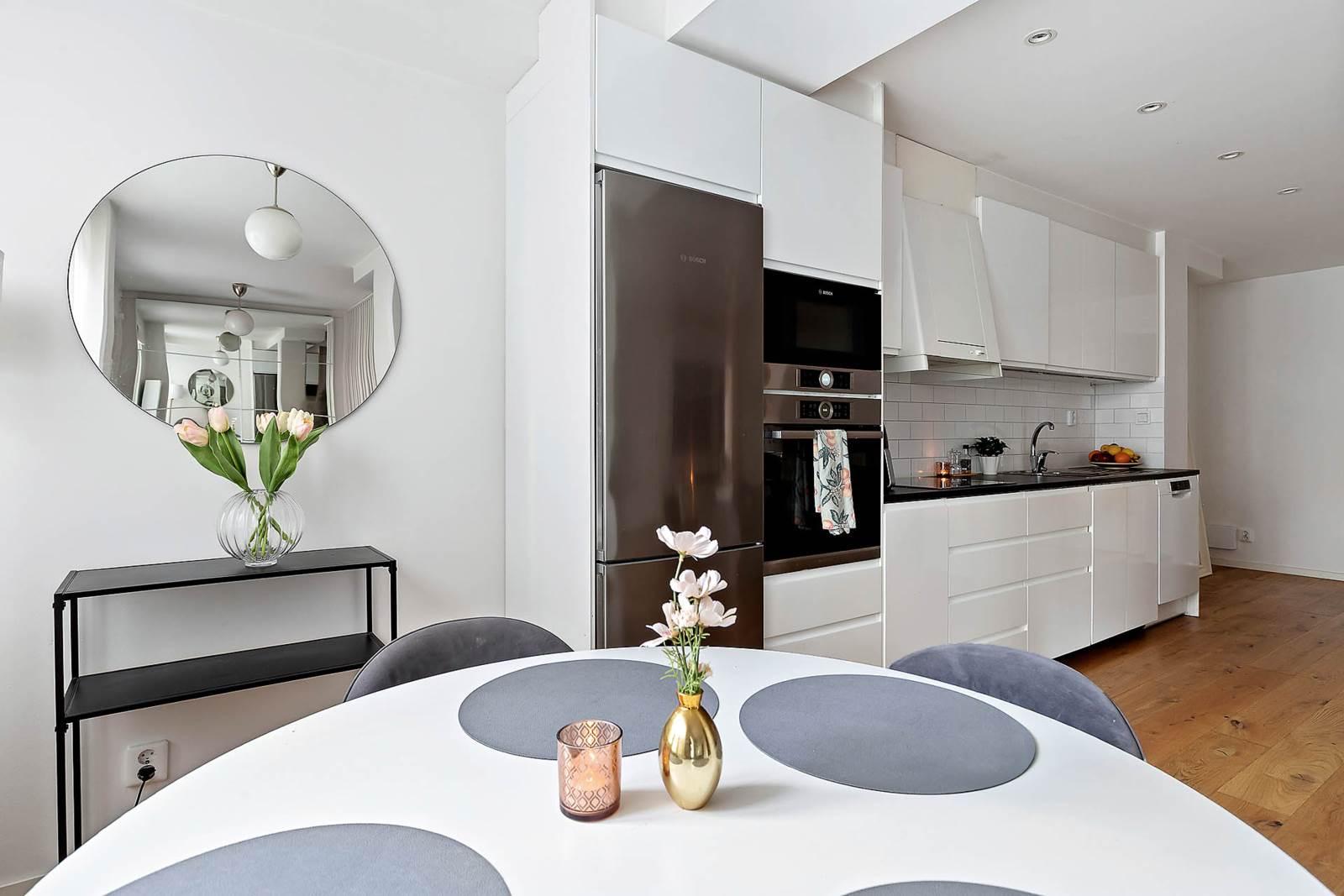 Bostaden erbjuder en social och öppen planlösning där kök och vardagsrum samspelar på ett naturligt sätt. Det stilrena köket går i vitt och erbjuder gott om förvaring, bra arbetsytor samt full maskinell utrustning. Intill finns en rymlig matplats vid fönster som skapar en naturlig samlingspunkt.