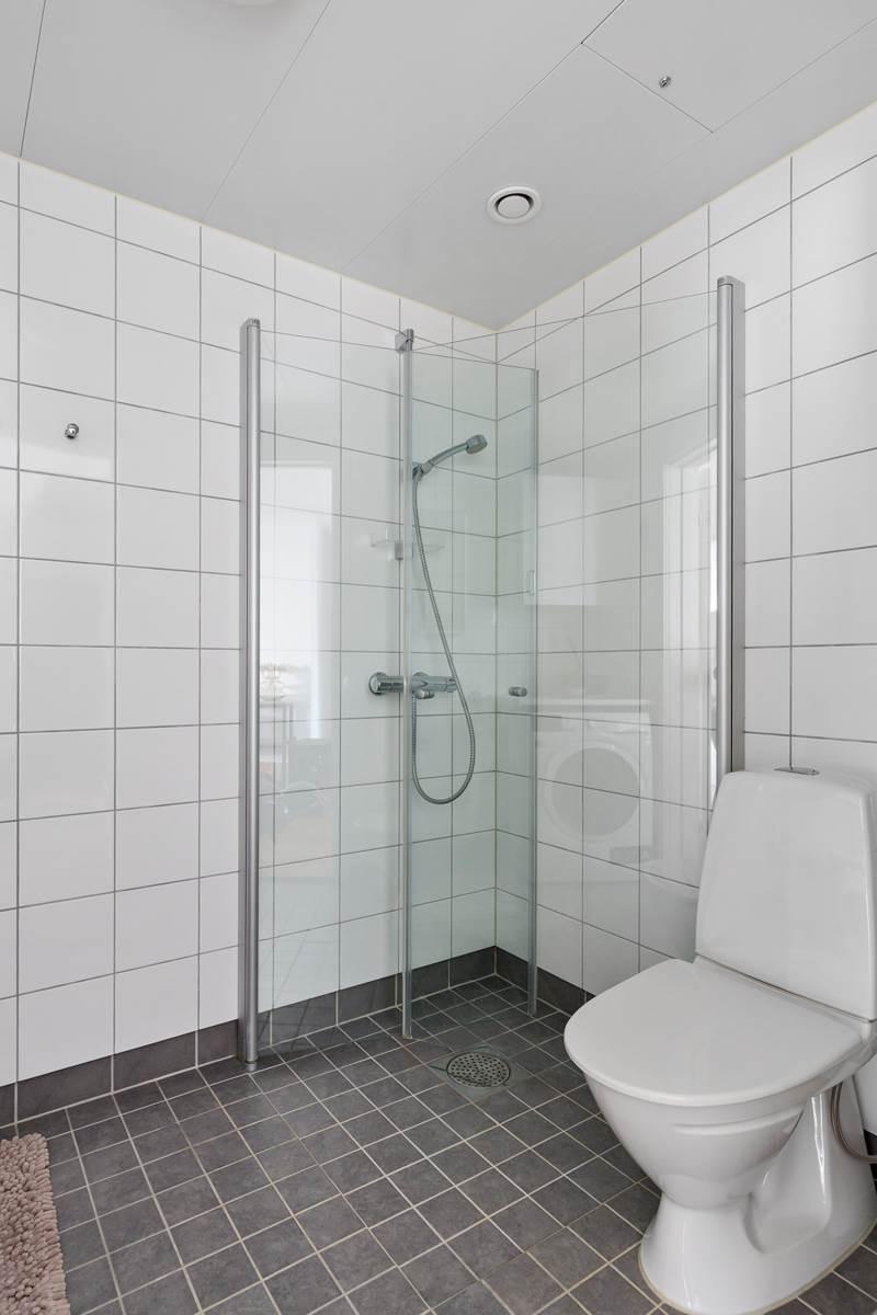 Hallen erbjuder gott om plats för avhängning och förvaring i garderober. Det helkaklade badrummet är modernt och fräscht med ljusa väggar, klinkergolv med golvvärme, dusch med glasväggar samt en kombinerad tvättmaskin och torktumlare.